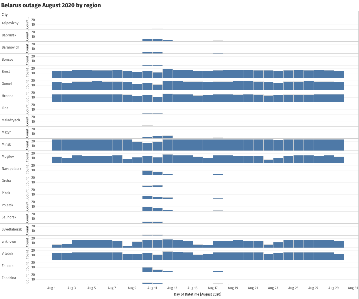 Source: Internet Outage Detection and Analysis (IODA): Belarus (August 2020), https://ioda.caida.org/ioda/dashboard#view=inspect&entity=country/BY&lastView=overview&from=1596114973&until=1598534173