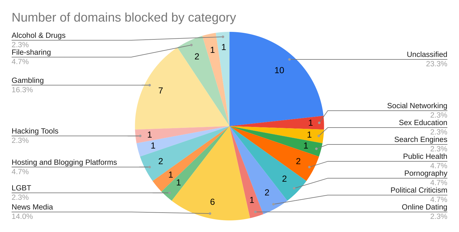 The OONI explorer measurements collected from Jan to June 2022 show that 43 websites (national and Intergovernmental Organizations website) are blocked by DNS, mainly by VIETTEL (CAMBODIA) PTE., LTD. (AS38623) and S.I Group (AS38623). The highest number of blockings were found to be in Gambling and News Media categories.