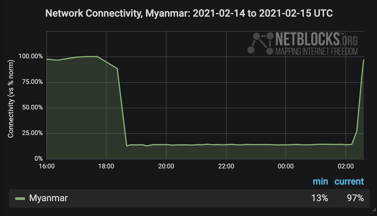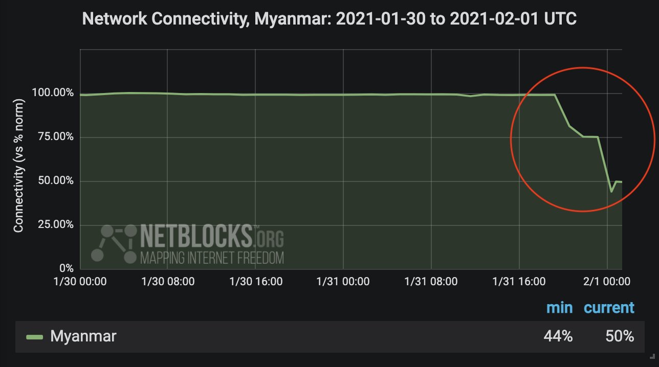 Netblocks. (2021, January 31). _Internet disrupted in Myanmar amid apparent military uprising. _https://netblocks.org/reports/internet-disrupted-in-myanmar-amid-apparent-military-uprising-JBZrmlB6 ↩︎