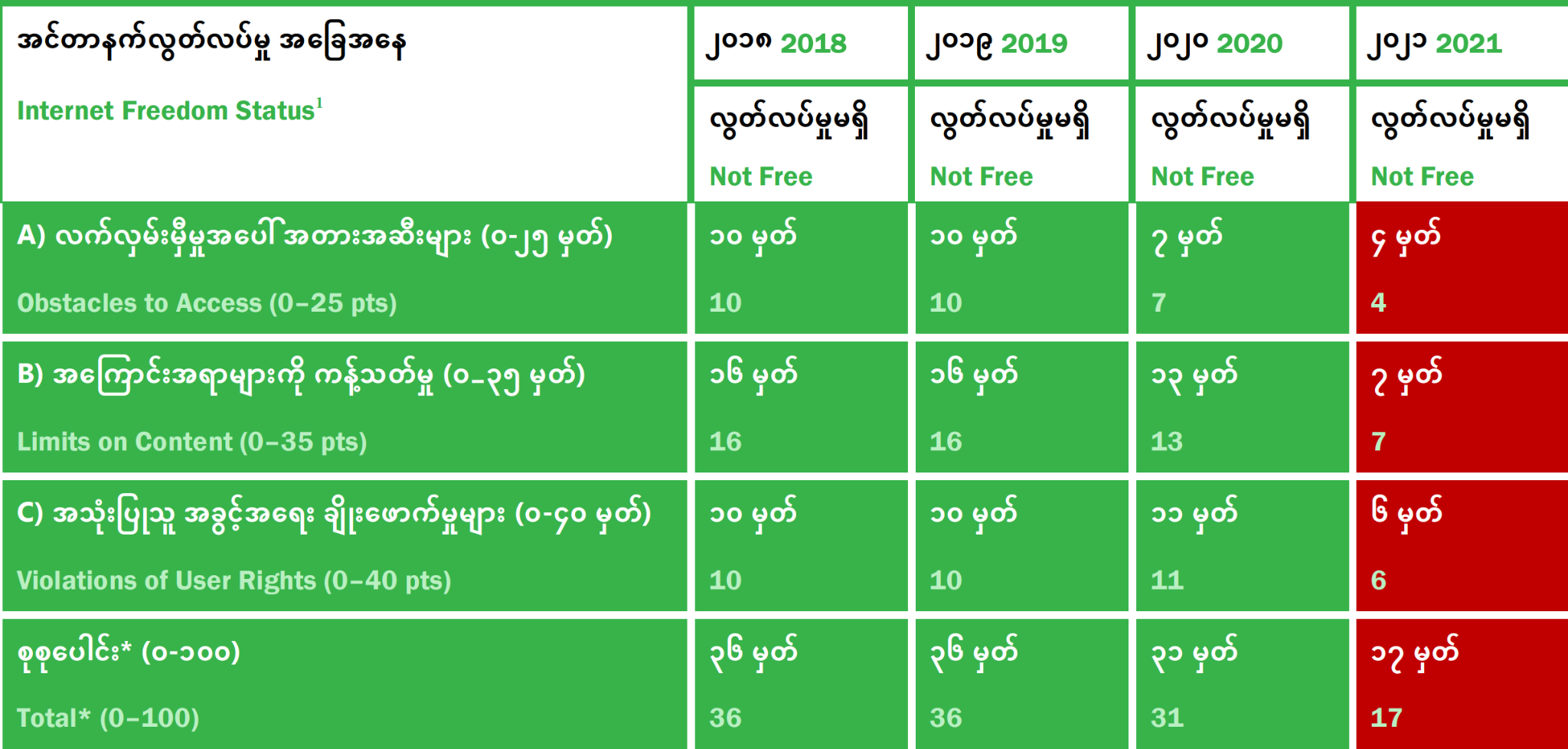 Freedom House. (2021). _2021 Myanmar Country Report. _https://freedomhouse.org/country/myanmar/freedom-net/2021 ↩︎