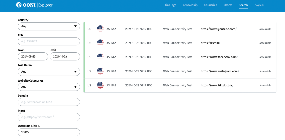 We are excited to share that you can now easily find and aggregate measurements from your specific OONI Run v2 link through OONI Explorer! Specifically, you can filter measurements in both the OONI Explorer Search Tool and Measurement Aggregation Toolkit (MAT) based on the ID of your OONI Run v2 link (“OONI Run Link ID”).