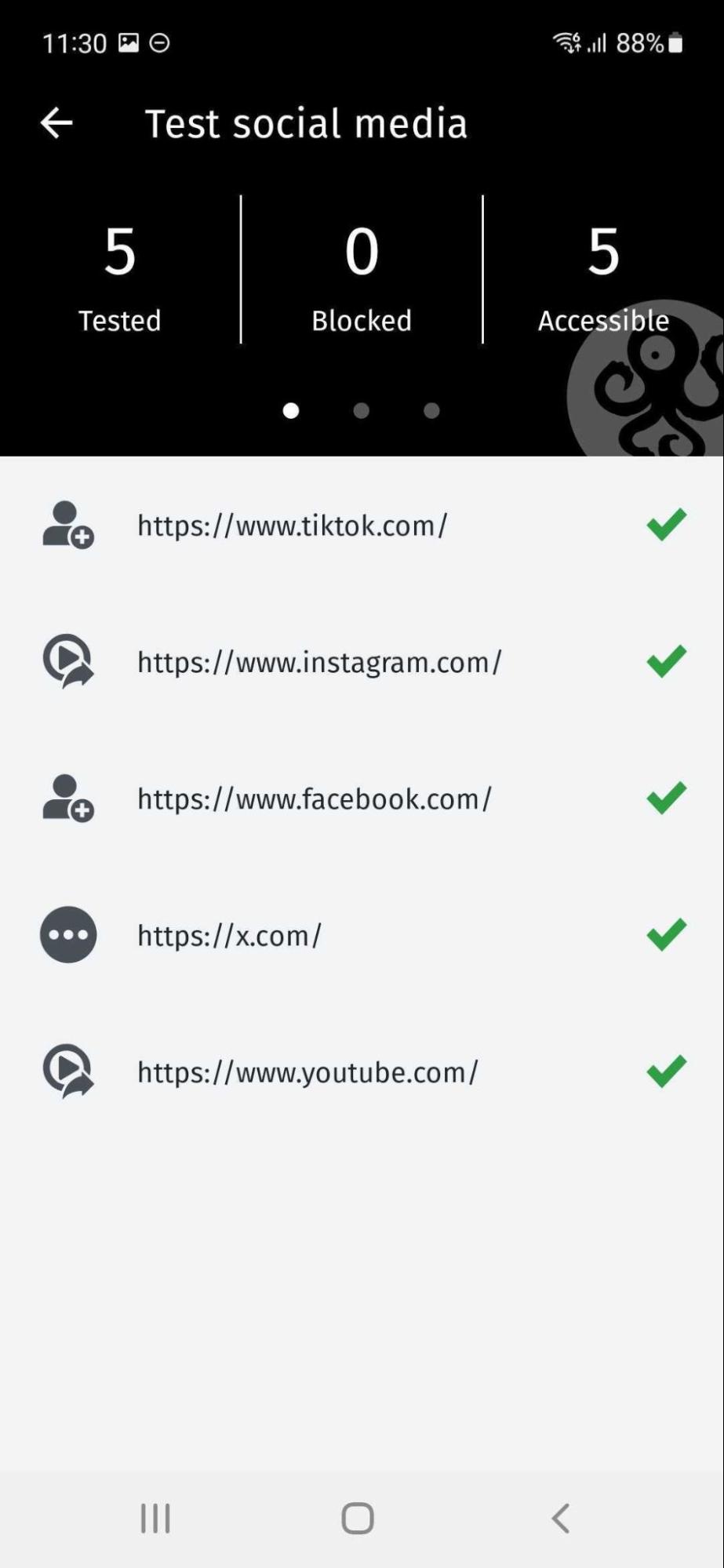 As you can see from the above example, we have opened an OONI Run link for the testing of social media in our OONI Probe Android app. This shows information about the requested testing, as well as the list of websites that we are being asked to test.