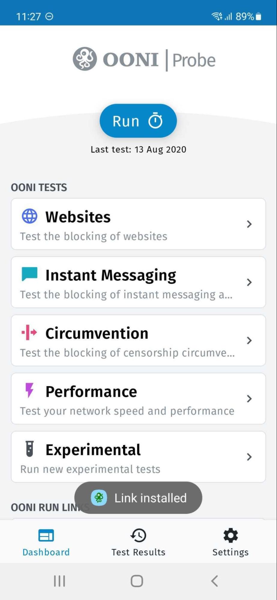 Step 3. To test the websites included in the OONI Run link, tap Install Link in the bottom right corner of the screen. This will install the OONI Run link in your OONI Probe mobile app, enabling you to change your OONI Run link settings and to uninstall the OONI Run link at any time.