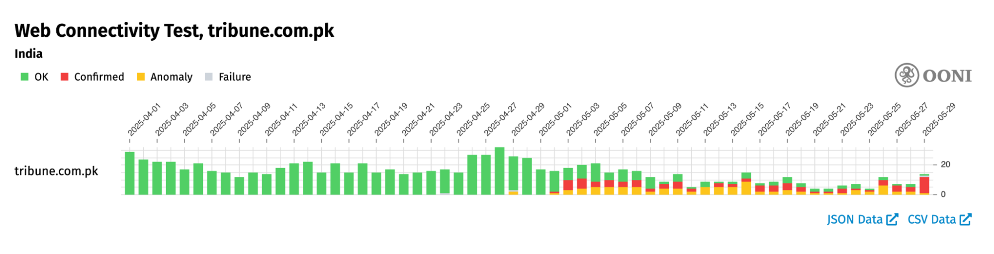 Chart: OONI Probe testing of dailytimes.com.pk and live.samaa.tv in India between 1st April 2025 to 29th May 2025 (source: OONI data).