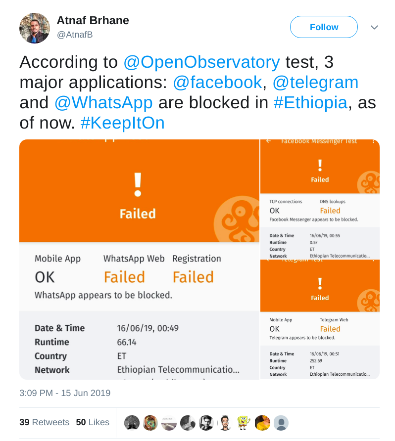 Once internet access was restored, OONI Probe users in Ethiopia performed tests and shared their findings on Twitter.